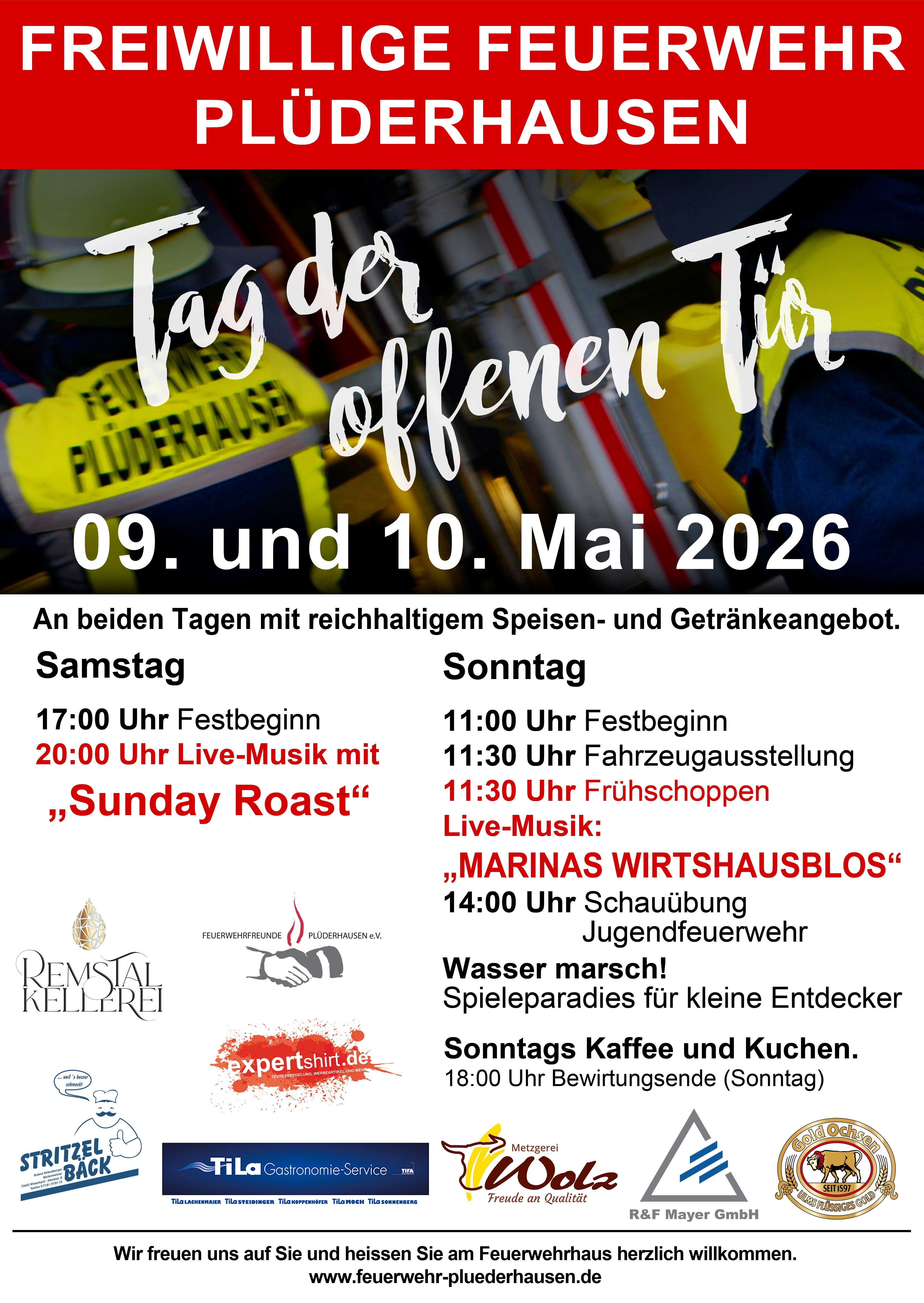 Neben einer Fahrzeugausstellung, der Schauübung der Jugendfeuerwehr um 14:00 Uhr und Wasserspielen für die kleinen Besucher, gibt es an beiden Tagen ein reichhaltiges Speisen und Getränkeangebot. Am Sonntag öffnet das Kaffee Florian mit selbst gebackenen Kuchen im 1. OG des Feuerwehrhauses. Am Samstagabend mit live-Musik und Barbetrieb.